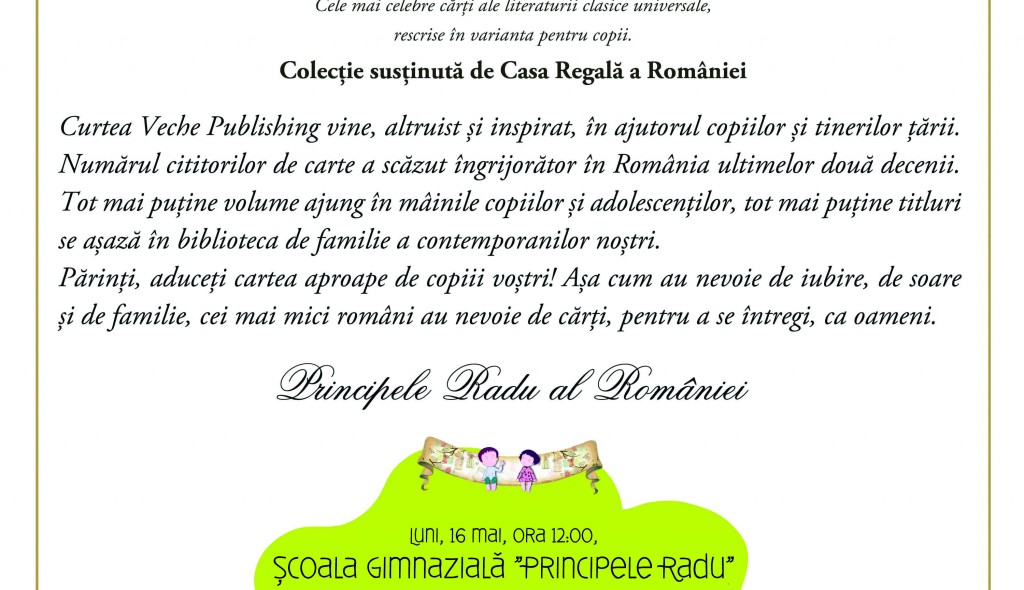 Luni, 16 septembrie, va avea loc deschiderea anului scolar in Adjud, judetul Vrancea. Intalnirea cu tinerii cititori si cu parintii lor va avea loc la scoala Gimnaziala „Principele Radu” (Str. Tudor Vladimirescu, nr. 7A) incepand cu ora 12.00. ASR Principele Radu va vorbi despre un program alternativ de lectura propus de Curtea Veche Publishing prin colectia “Cartile copilariei”, o serie de repovestiri pe intelesul copiilor ale marilor opere literare. Curtea Veche Publishing doreste sa readuca lectura printre placerile celor mici si sa traga un semnal de alarma intregii societati. Toti copiii si parintii din Adjud sunt bineveniti la acest eveniment.